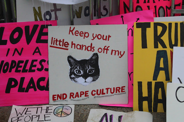 The March continued along Constitution. Many marchers were sitting on the stairs of the National Archives, an appropriate resting place as the National Archives houses the US Constitution. Many of the marchers turned on 12th toward Pennsylvania -- Trump's hotel, once the Old Post Office, is on the corner of Pennsylvania and 12th. Police stood behind the barricades. They did nothing to prevent marchers from leaving their signs at the barricades. A statue of Ben Franklin is a the front the hotel. He, too, joined the march.